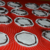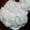 Każdy płatek kosmetyczny dzielimy na dwie części. Będą one mniej sztywne i ładniej ułożą się na bombce. Kiedy już przygotujemy białe kręgi, rozpoczynamy ich montowanie na styropianowej powierzchni. Za pomocą śrubokręta wciskamy każdy okrąg w styropian (na głębokość około 0,5 cm). Najlepiej na miejsce mocowania wybrać środek płatka, ale nie jest to warunek konieczny. W ten sposób zapełniamy całą powierzchnię kuli. Na koniec (przedstawionym wyżej sposobem), mocujemy tasiemkę, za pomocą której bombka będzie mogła zawisnąć na świątecznym drzewku.