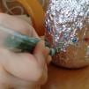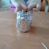 1. Owijamy słoik większym kawałkiem folii aluminiowej i ozdabiamy klejem brokatowym – tak powstanie nasza doniczka dla drzewka.