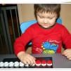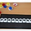 Wymyśliłam mojemu trzyletniemu synkowi prostą pomoc do ćwiczenia rytmu. Dziesięć gwintów wyciętych z opakowań po mleku nakleiłam na pasek kartonu. Skompletowałam nakrętki w czterech kolorach.