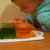 Oglądamy wspólnie z dzieckiem otrzymane galaretki i zastanawiamy się, czym się one różnią (kolorem, kształtem, wysokością). Pytamy dziecko, której galaretki jest najwięcej. Sprawdzamy doświadczalnie, której galaretki jest więcej, krojąc kolorowe bloki i układając pokrojone kawałki w taki sposób, aby powstały z nich podobne bryły. Odkrywamy, że wbrew temu, co sądziliśmy wcześniej, każdej galaretki jest tyle samo.