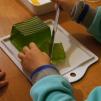 • 3 pojemniki o różnych kształtach, różniące się podstawą (kwadratowy i prostokątny, szerokie i wąskie) • nożyk dla dzieci • deska do krojenia.