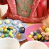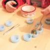 Stolik nakryty, a na nim: pojemniki do lodu, pojemnik na jajka, jednorazowe kubki plastikowe, miseczki, łyżki, drewniane szczypce, pęseta, nakrętki od butelek, kulki szklane, ziarna soczewicy. Tylko tyle, a może aż tyle!