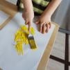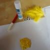 Dziecko za pomocą widelca i farby tworzy postać kurczaka.
