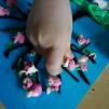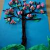 Z bibuły wycinamy listki i przyklejamy je do gałązek drzewa. Przyklejamy również pomalowany popcorn.